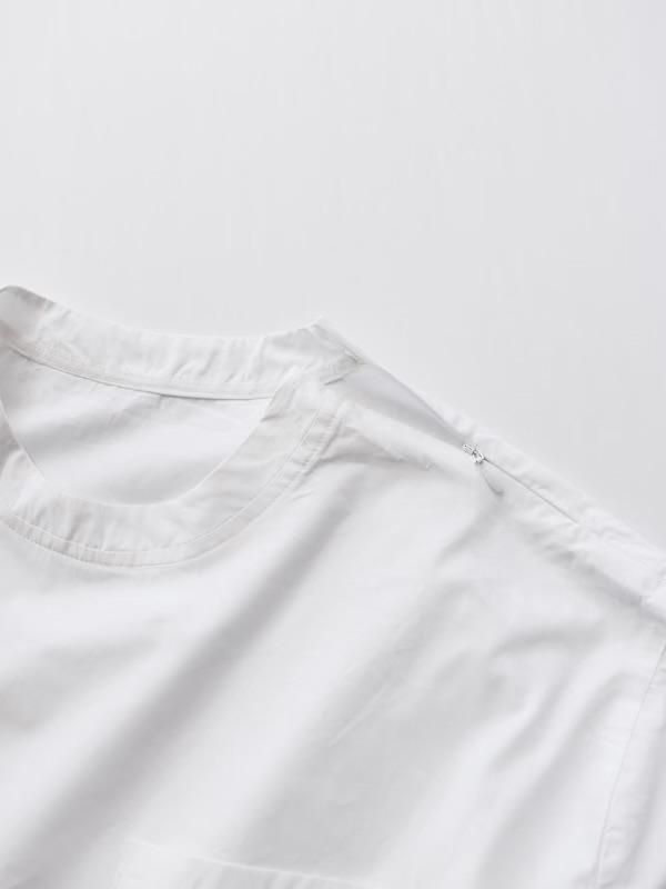 薄手のタイプライター生地の布帛のTシャツ。首部分に着脱しやすいようにファスナーが付いています。身幅は広めで着丈は短め。カラーはホワイトのみ。