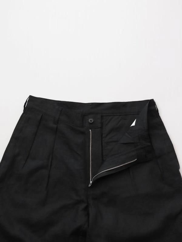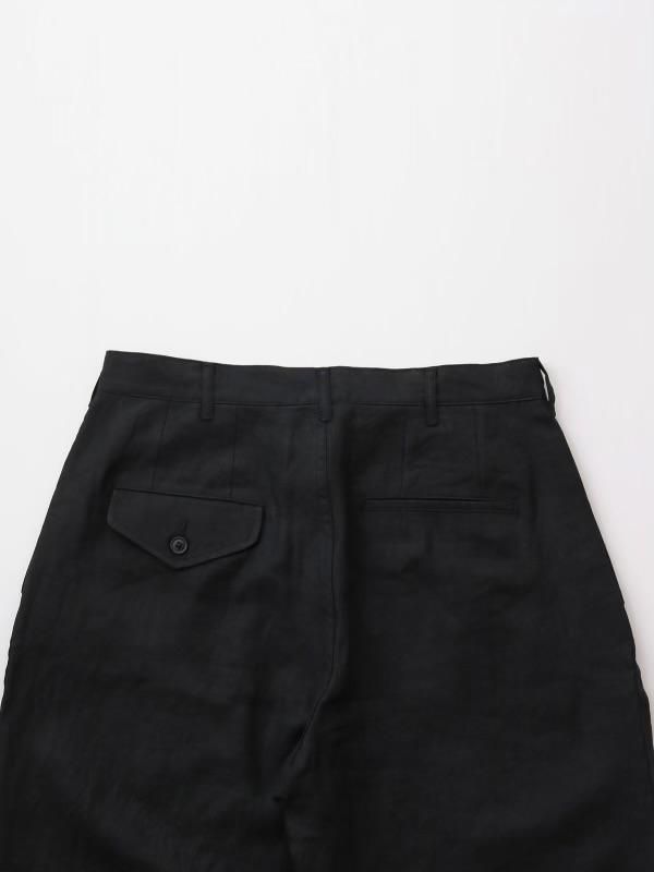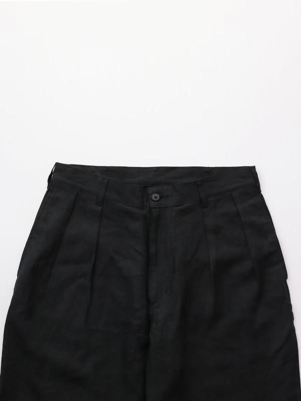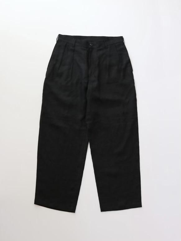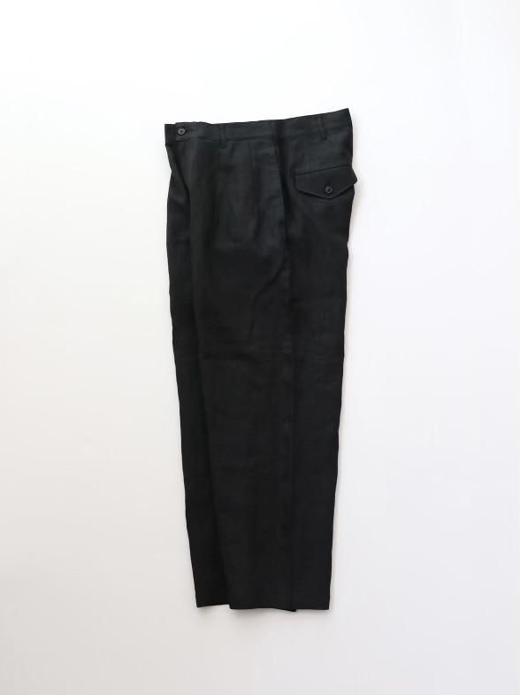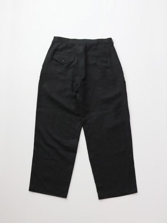 guillemets layout studioの猿山 修氏と共同で制作したリネンパンツ。ウエストにタックが入っているので腰周りヒップ周りはゆったりとしていて 太ももから裾にかけて少しテーパードしたシルエット。カラーはブラックのみ。