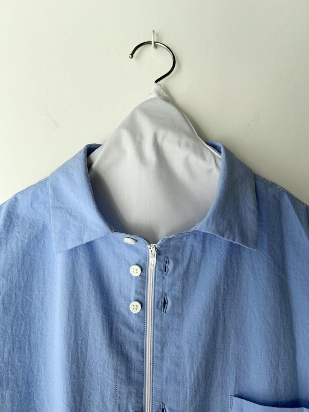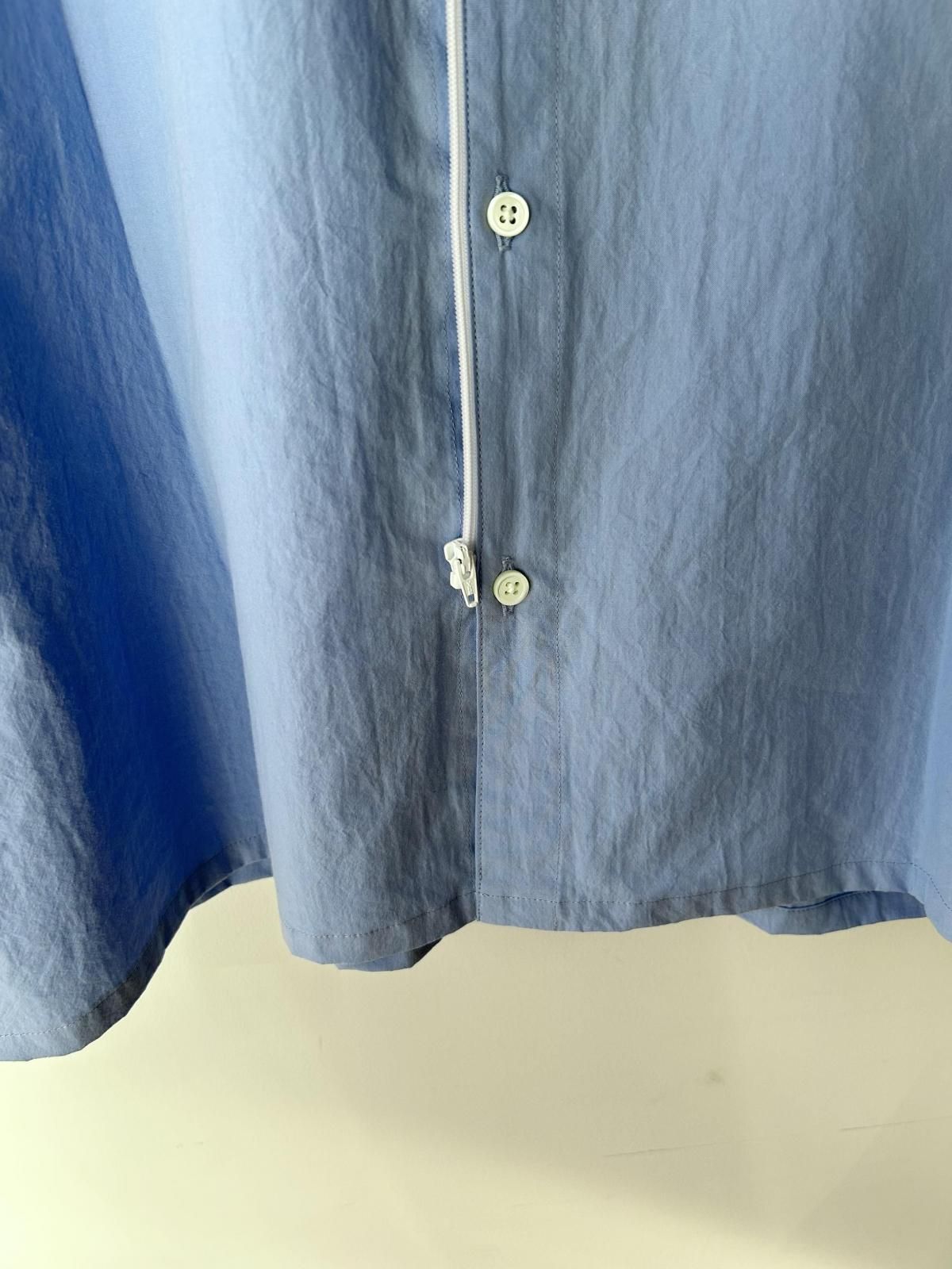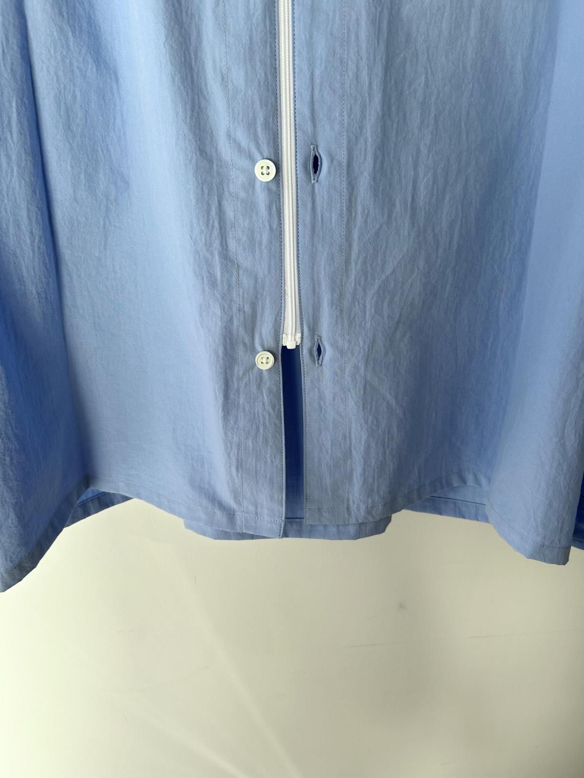 サイズ感、生地をアップデート。フロントはボタンとファスナーで留められる2way仕様。衿にボリュームを出すために中綿を入れています。生地はコシのあるコットンポプリン。サイズは身幅広め、着丈短めのボックスシルエット。